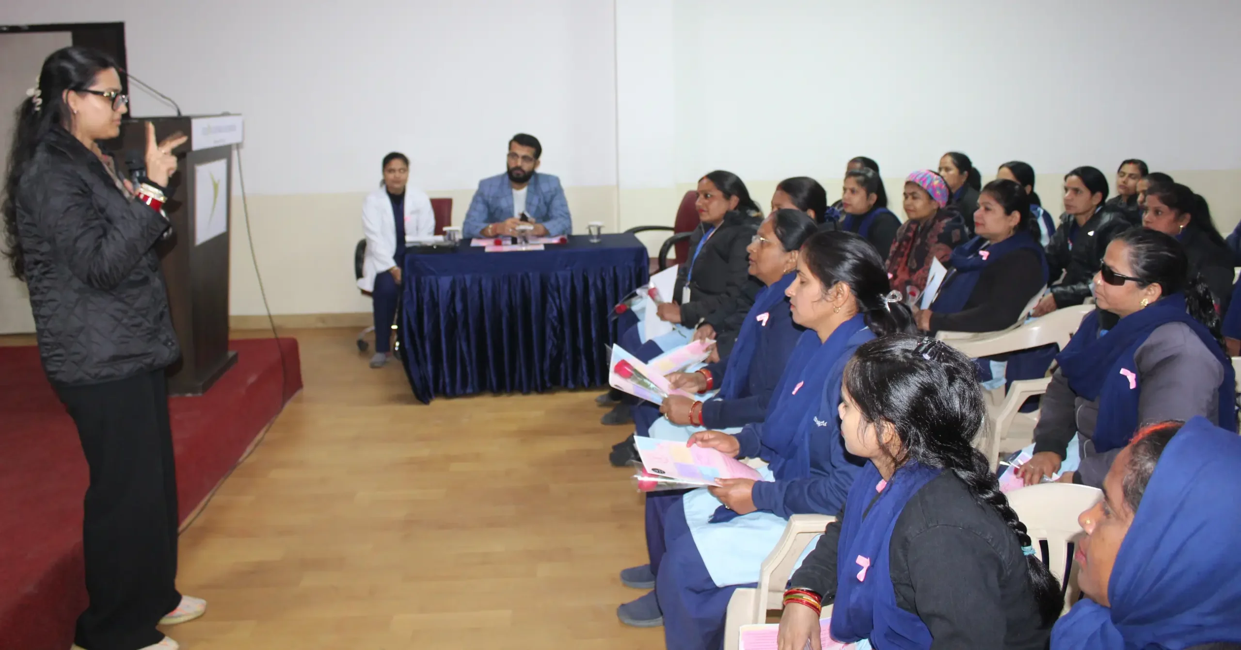 A team of three gynecologists from Astha Hospital were invited, who provided a brief and informative session on identifying early symptoms and taking necessary precautions. Informative pamphlets were distributed for better understanding. To enhance participation, pink ribbons were tied on the support staff and a fingerprint activity was conducted, where the fingerprints were arranged into a heart on a canvas symbolizing care and awareness.