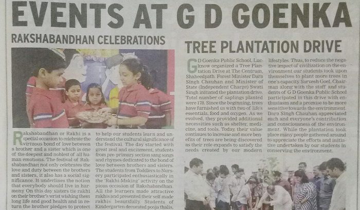 Recently Events at GD Goenka Public School, Lucknow organized. Rakshabandhan or Rakhi is a special occasion to celebrate the virtuous bond of love between brother and sister which is one of the deepest and novelist of all human emotions. The festival of Raksha Bandhan not only celebrates the love and duty between the brothers and sisters, but it also has social significance. It underlines the notion that everybody should live in her harmony. On this day sisters tie Rakhi on their brother’s wrist wishing them long life and good health and in return the brother pledge to protect her sister from any harm thereby expressing love care and joy among themselves.